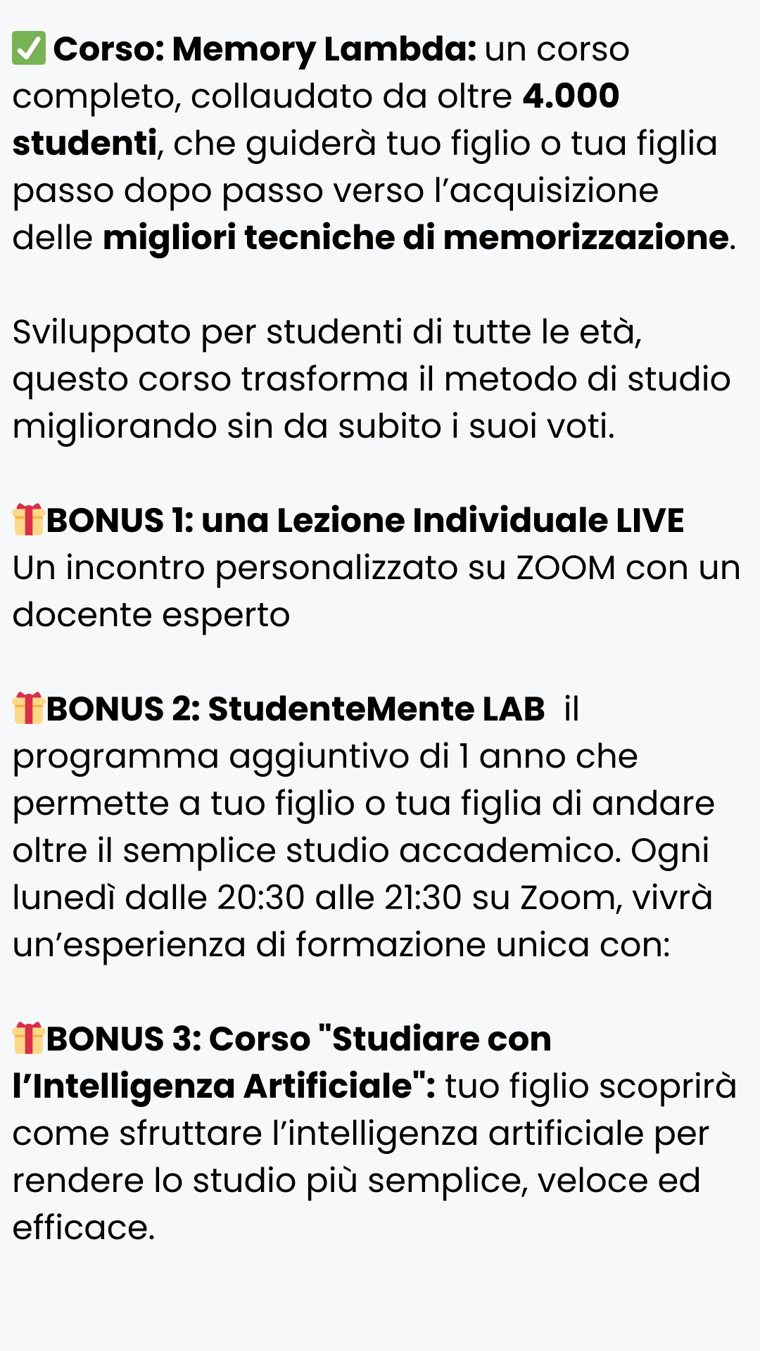 Grazie al corso ho molto più tempo libero che sto dedicando allo studio per i test di ammissione per l'università. "Usando le tecniche che vengono spiegate al corso, sono riuscito ad alzare i miei voti anche i tempi di studio sono diminuiti: prima dovevo studiare più di 2 ore, mentre adesso riesco a studiare in meno di un'ora"